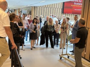 Arrangementet endte med en rundvisning i DTUs bygning 313 – #ClimateChallengeLaboratory, hvor deltagerne fik et indblik i forskningsfaciliteter og teknologier, der skal bidrage til fremtidens bæredygtige løsninger. Undervejs blev der også mulighed for at opleve det 27 meter lange kunstværk #PHOTOSYNTHESIS af Tue Greenfort – et værk inspireret af cyanobakterier, som snor sig gennem trapperummet og forbinder kunst, natur og teknologi.