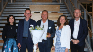 Formanden for Lyngby-Taarbæks bæredygtighedsudvalg, Gitte Kjær-Westermann overbragte med disse ord årets bæredygtighedspris til DTU v. campusdirektør Anders B. Møller og bygherrechef Ben Kahn for byggeriet “Climate Challenge Laboratory”.